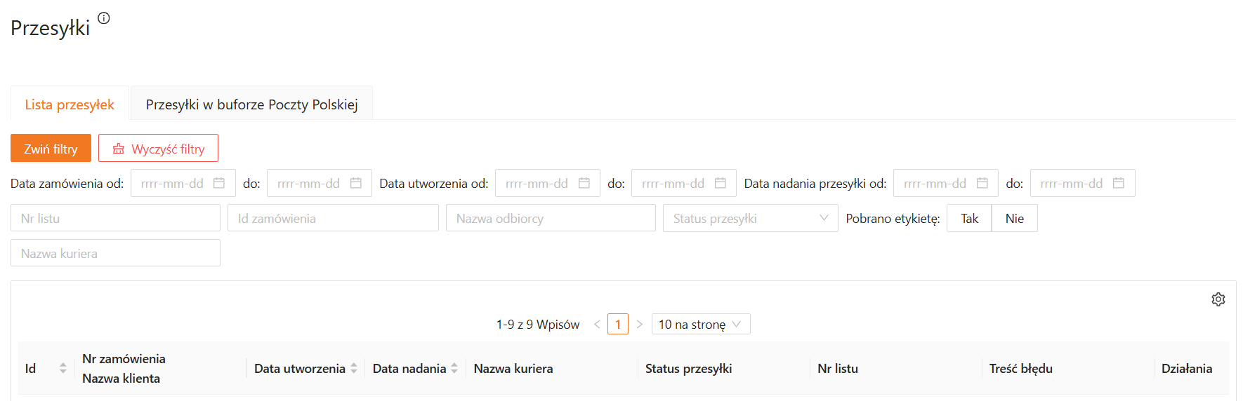 Dzięki dostępności kilkunastu filtrów w nagłówku widoku możesz również wygodnie przeglądać wybrane przesyłki. Przycisk Zwiń filtry służy do ukrycia pól filtrowania (wybrane filtry nadal działają), natomiast Wyczyść filtry resetuje ustawienia wszystkich wybranych filtrów. Poniżej znajdziesz krótki opis każdego z filtrów.