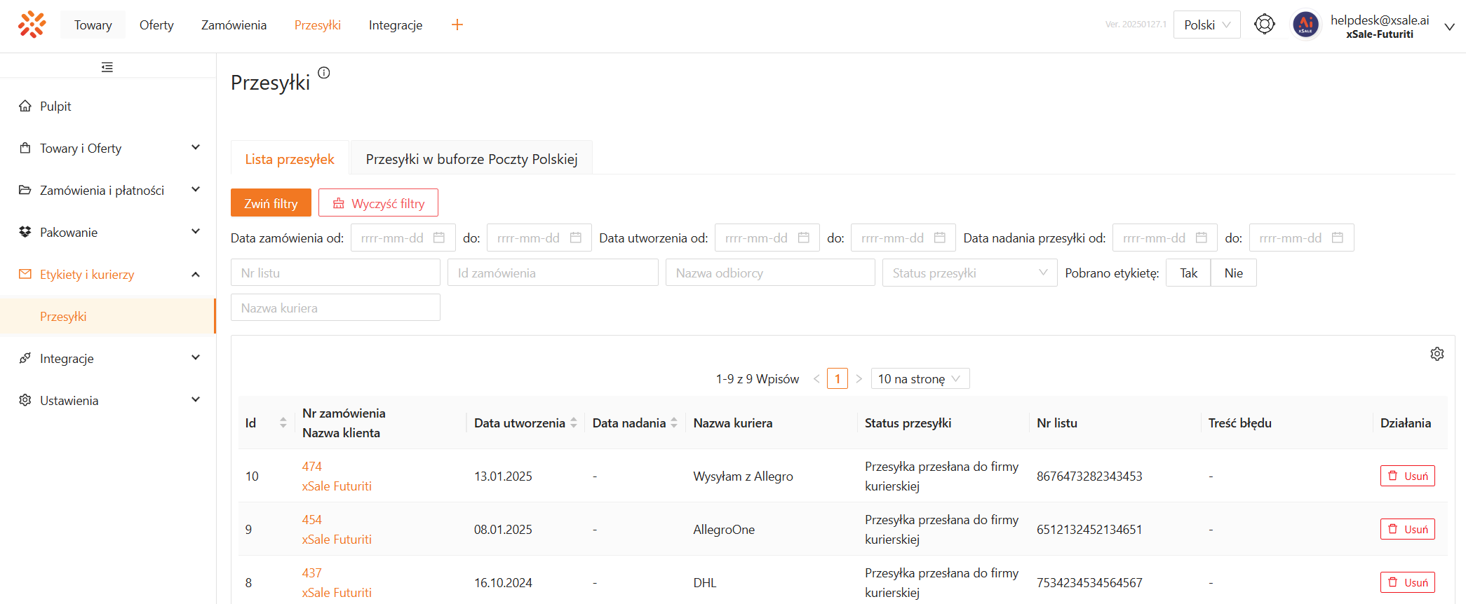 - Id zamówienia – id zamówienia z xSale, z którym powiązana jest przesyłka