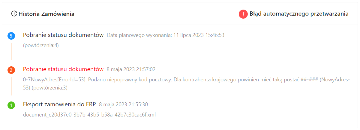 - Czerwony – proces nie został wykonany i nie będzie automatycznie ponowiony. W takim przypadku pod nazwą procesu wyświetlany jest także komunikat błędu zwrócony np. przez system ERP.