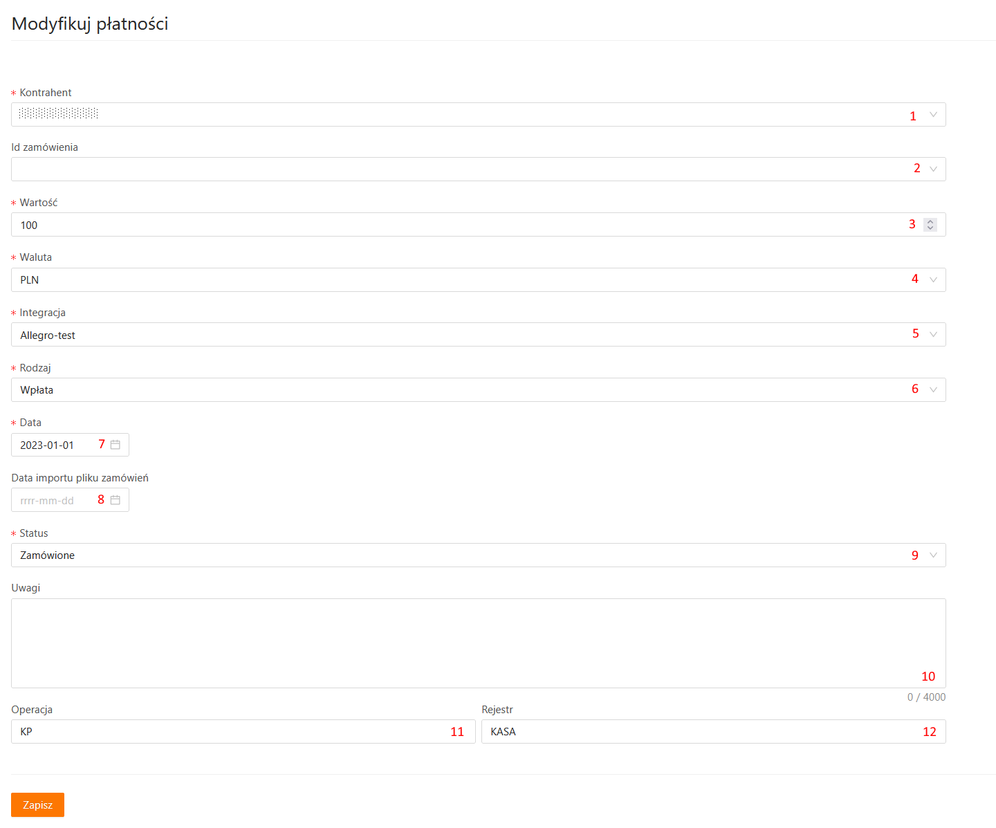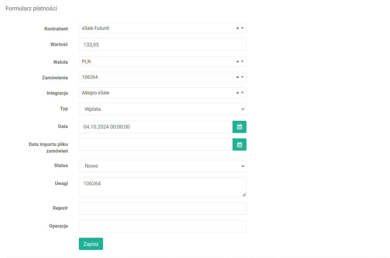 - Uwagi – dodatkowe informacje o płatności. W przypadku płatności zaimportowanych automatycznie z zamówieniem pole to zawiera numer zamówienia