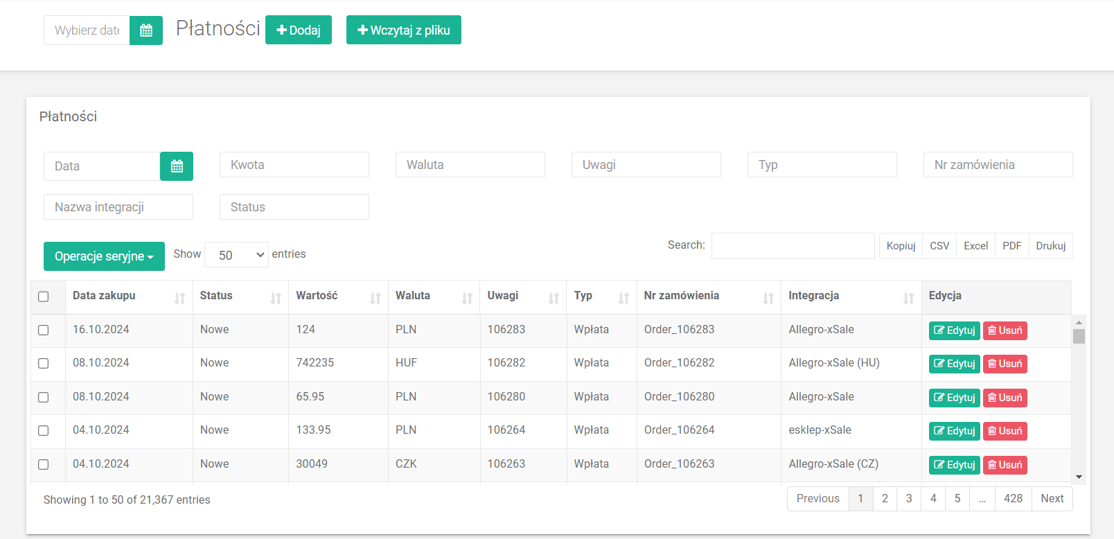 - Data – data dodania płatności