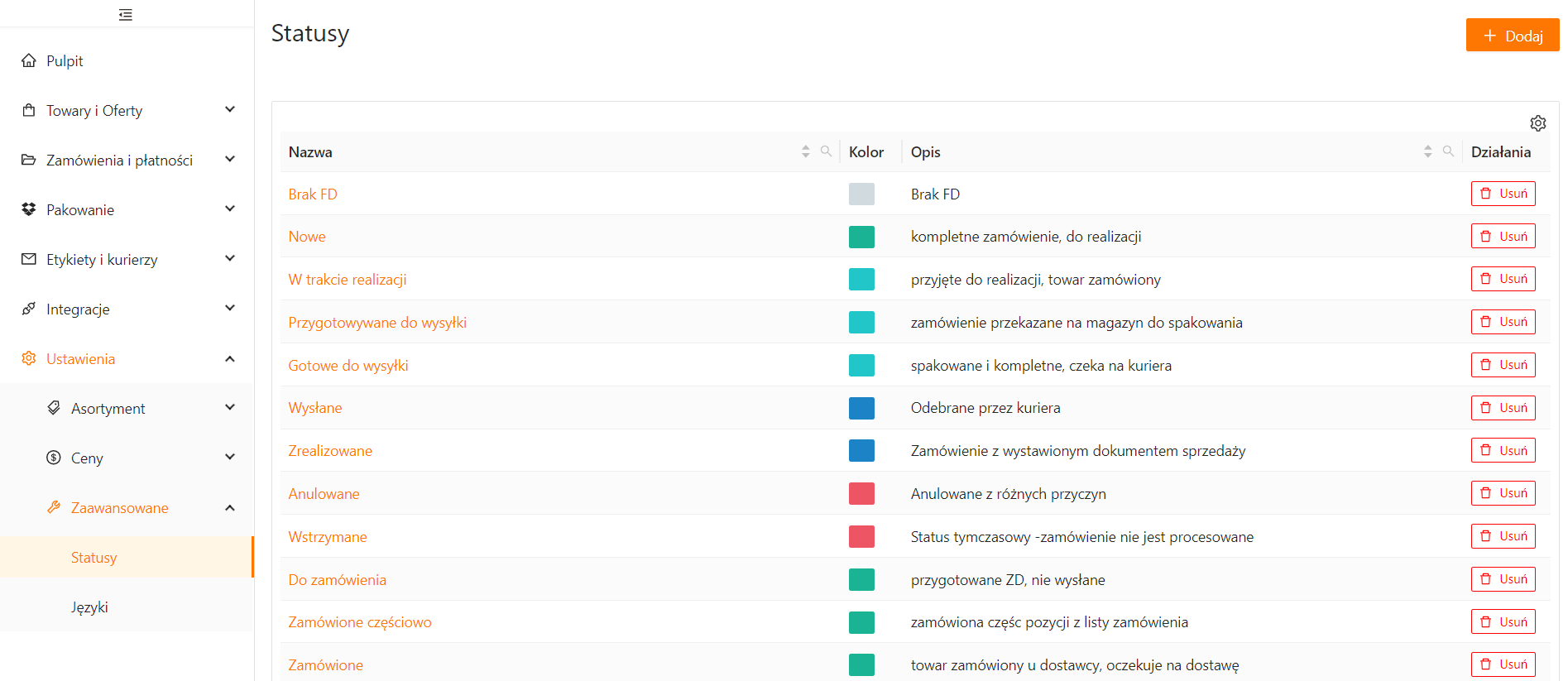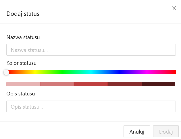 Aby dodać nowy status, kliknij przycisk +Dodaj. Następnie wprowadź nazwę statusu i krótki opisu oraz ustaw kolor, który będzie wyświetlany przy statusie na liście zamówień.