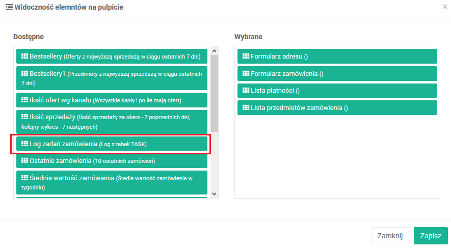 Do elementów widocznych trzeba przenieść Log zadań zamówienia nadając mu nazwę i ustawiając typ np. tabela klikalna. Po zapisaniu ustawień strony na zamówieniu pojawi się tabela z logiem w którym można sprawdzić komunikat błędu w przypadku problemów z importem zamówienia.