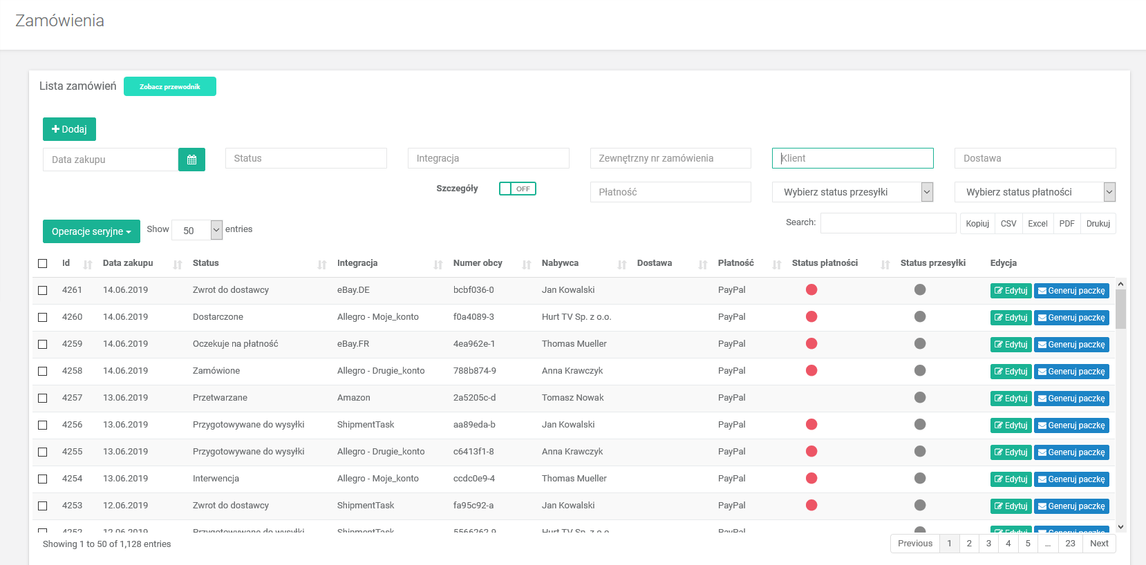 W wierszu każdego zamówienia znajdują się trzy przyciski: Edytuj, Usuń i Generuj Paczkę.