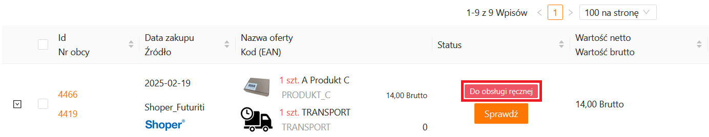 Zamówienia, które otrzymały status Do obsługi ręcznej zazwyczaj wymagają uwagi i podjęcia akcji (np. ze względu na brak danych niezbędnych do wykonania przez xSale kolejnych automatycznych akcji lub problem, który wystąpił w trakcie importu / eksportu / przetwarzania zamówienia. Aby ułatwić pracę z tymi zamówieniami, xSale wyświetla przy statusie dodatkowy przycisk Sprawdź, który pozwala sprawnie przyjrzeć się zamówieniu i podjąć akcję. Przycisk przekierowuje do historii zamówienia, gdzie jest widoczna przyczyna błędu.