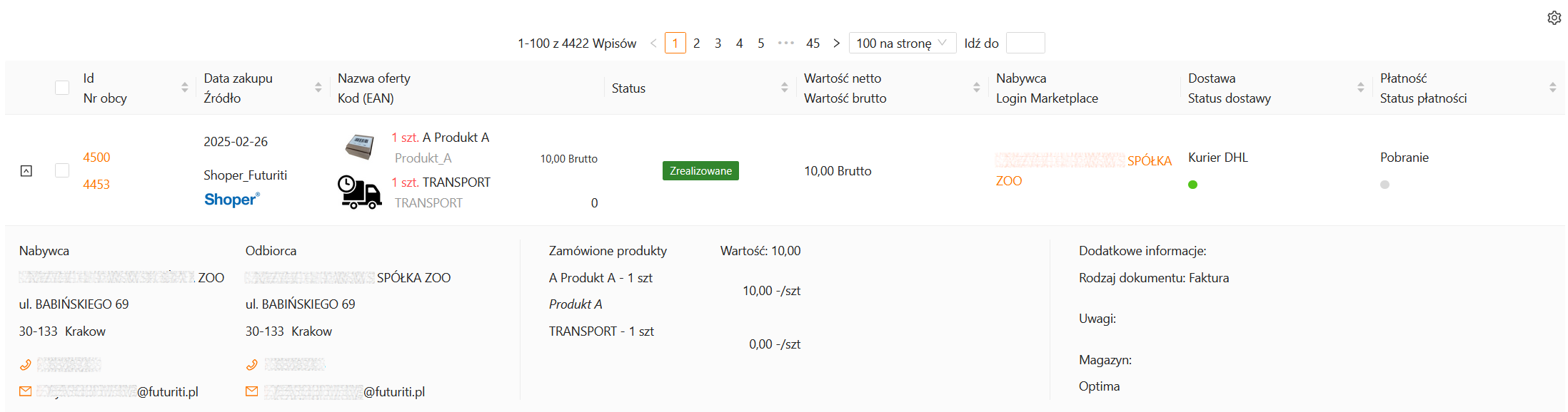 Przycisk Szczegóły On/Off wyświetla lub ukrywa na liście szczegółowe informacje o zamówieniu, w zależności od wybranej konfiguracji. Szczegółowe informacje to m. in. lista zamówionych produktów oraz dane adresowe kupującego i odbiorcy.