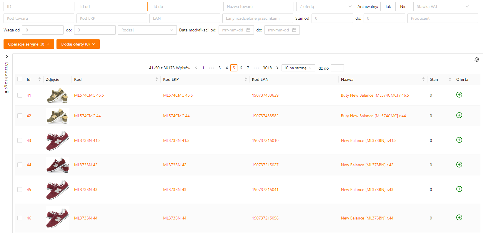 Po lewej stronie listy towarów znajduje się rozwijana zakładka z drzewem kategorii. Po wybraniu jednej z kategorii lista zostaje zafiltrowana tylko do towarów zawierających tę kategorię.