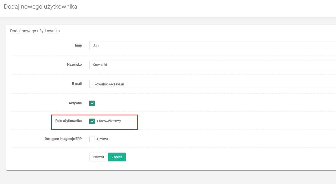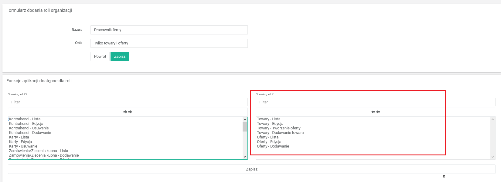 W ten sposób dodaną rolę można później przypisać do użytkownika w Konfiguracja –> Użytkownicy firmy.