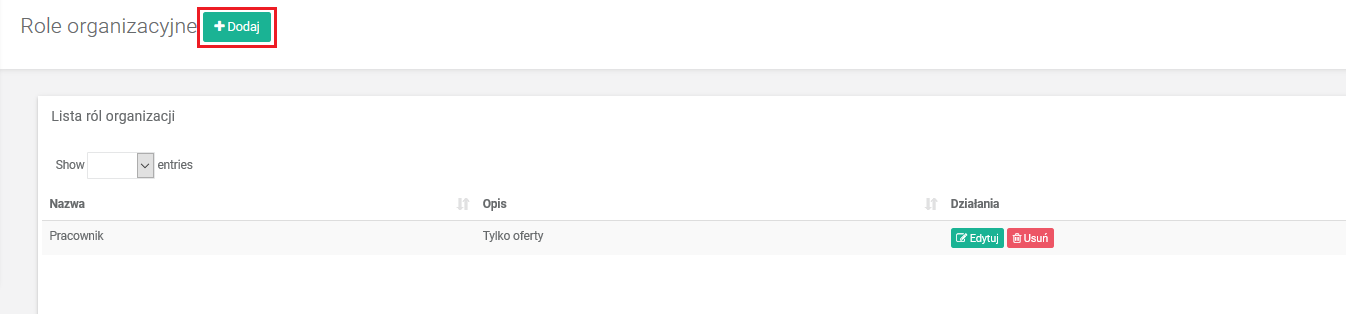 Za pomocą przycisku +Dodaj można definiować nowe role użytkowników, którzy będą mieć dostęp tylko do ograniczonych funkcji w systemie np. tylko do towarów i ofert.