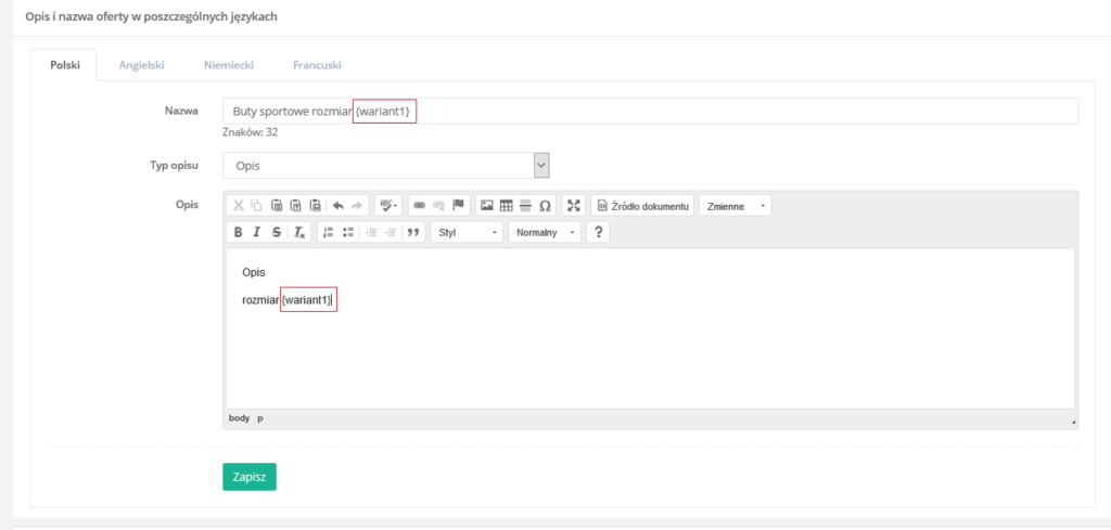 W nazwie oferty wpisujemy np. Buty sportowe rozmiar, a system sam dodaje na końcu blok z wartością {wariant1}. Podobnie w opisie oferty na końcu system sam dodaje blok {wariant1}.