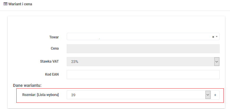 Przykład – oferta wielowariantowa, gdzie wariantem jest parametr Rozmiar.