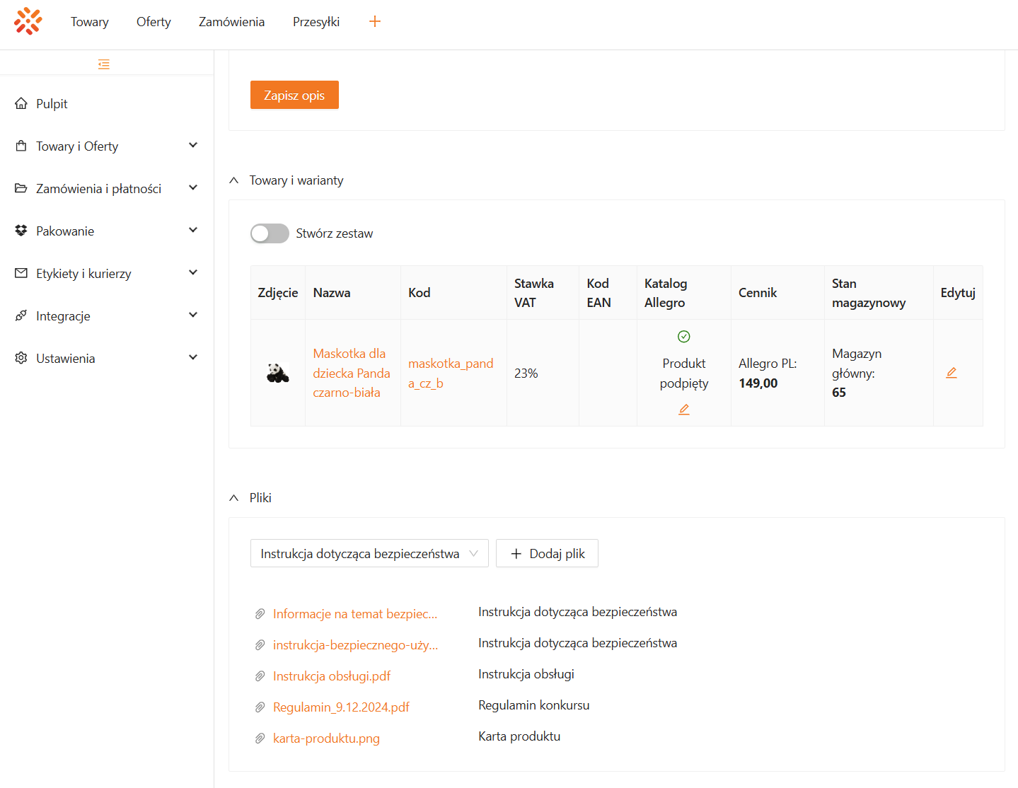 xSale umożliwia załączanie plików w ofertach oraz ich synchronizację z ofertami Allegro (jako załączników do ofert oraz informacji o bezpieczeństwie produktu). Ten poradnik zawiera informacje dotyczące dodawania plików i wyboru ich typu, w zależności od roli, jaką ma pełnić plik w kanale sprzedaży.