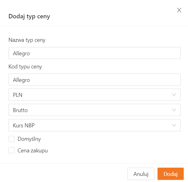 Aby dodać nową cenę, kliknij przycisk +Dodaj i uzupełnij pola formularza.
