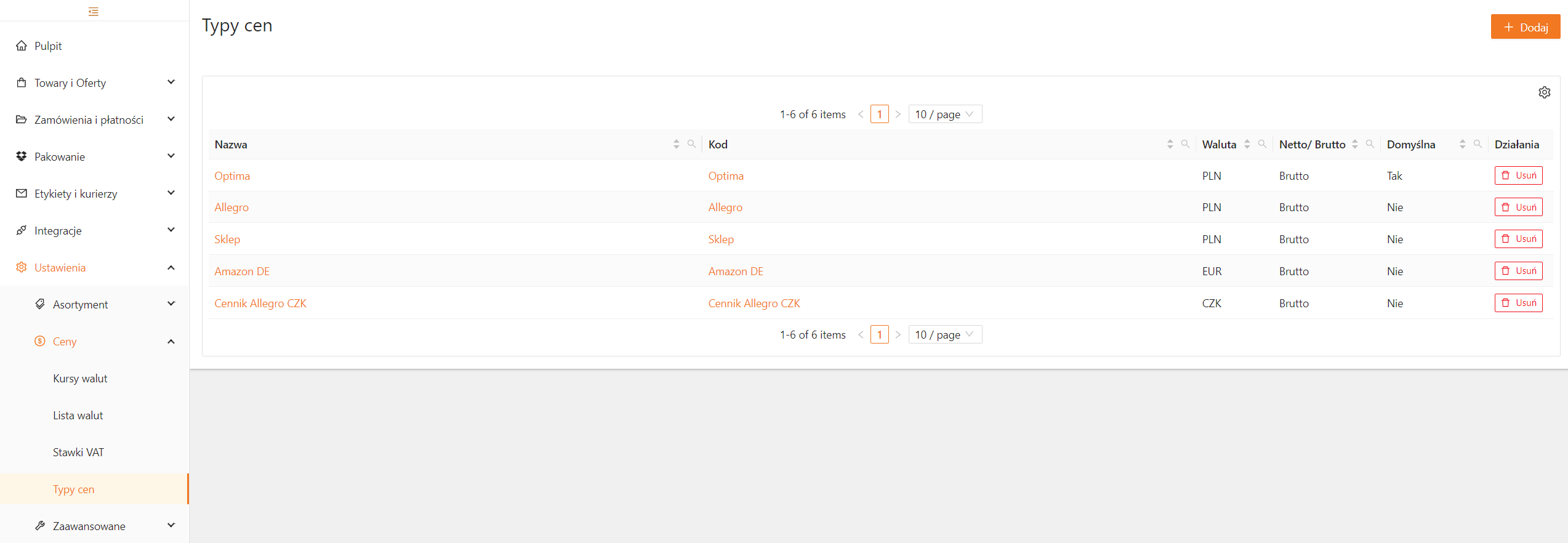 Wszystkie typy cen, zarówno pobrane z systemu ERP, jak i zdefiniowane w xSale, można sprawdzić w zakładce Ustawienia -> Ceny -> Typy cen. W tym miejscu można dodać nowy typ ceny, aby był dostępny do przypisania do towaru. Po przypisaniu cennika można nadać towarowi odpowiednią wartość kwotową.