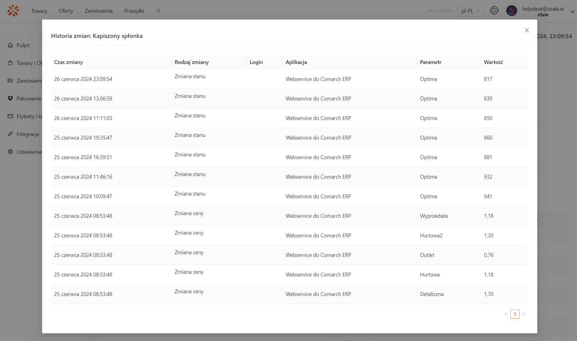 • Aplikacja – nazwa aplikacji lub mechanizmu, który odpowiada za wykonanie zmiany. Może to być np. Webservice do Comarch ERP, Proces wczytywania pliku, REST API xSale (interfejs v2), UI v1, Procesy automatyczne xSale (lub nazwa konkretnego procesu).