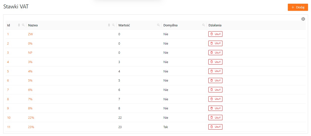 W tym miejscu można zdefiniować stawki VAT w xSale oraz ustawić stawkę domyślną dla całego systemu.